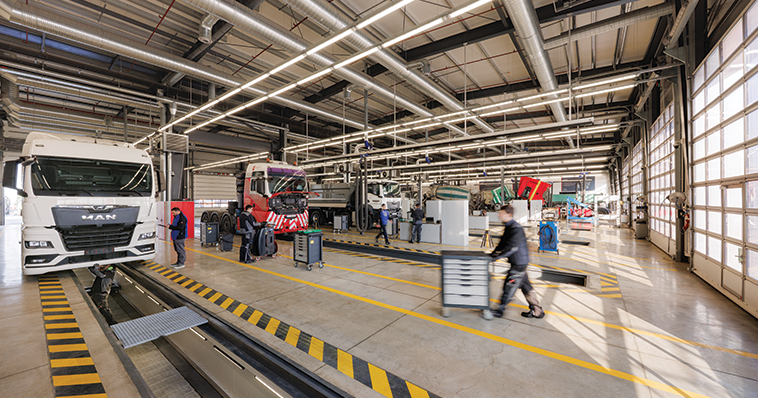 The four-hectare service centre complex consists of four separate blocks, each dedicated to a different function. All areas are unified by a common concept: providing customers with an all-encompassing service experience utilising state-of-the-art equipment, whether for chassis inspection, engine diagnostics, or electrical system analysis. Dedicated units are also available for paintwork repair, bodywork, and refrigeration systems.