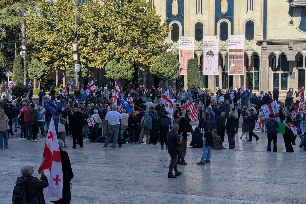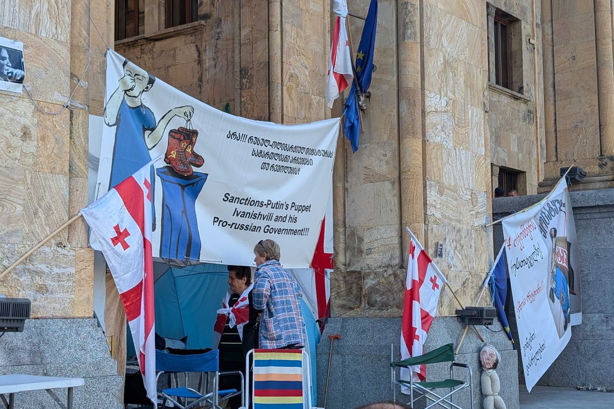 Protesters have begun to gather outside the parliament building on Rustaveli Avenue, blocking the road. A demonstration is expected to take place there at 16:00.
